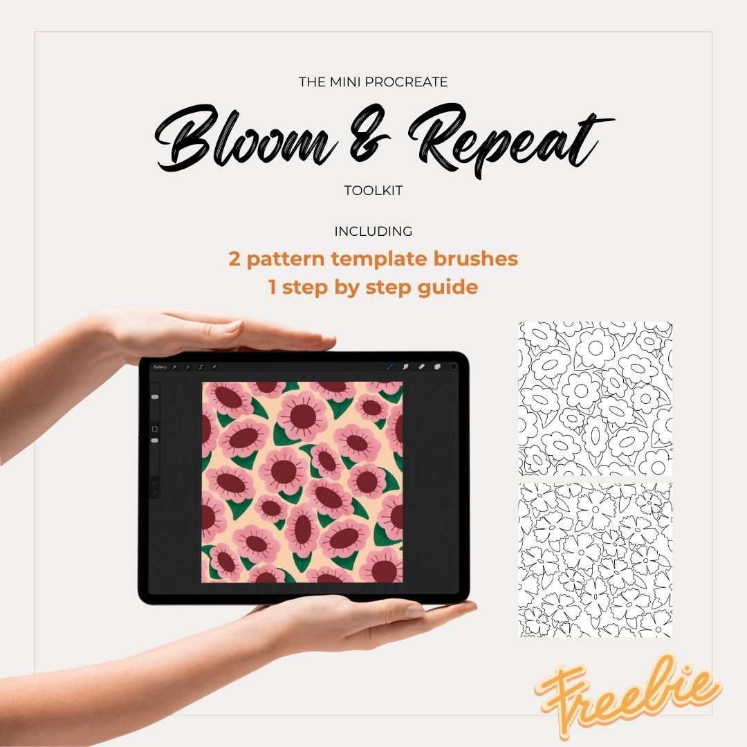 Download Bloom & Repeat Mini Toolkit — a free Procreate mini-kit with two floral pattern templates and a step-by-step guide to help you try seamless pattern design with ease.